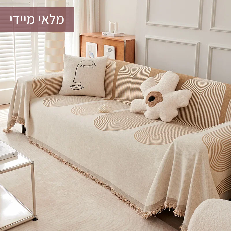 כיסוי לספה בגווני בז' עדינים עם דוגמה גיאומטרית נעימה לעין. מוסיף חמימות ועיצוב מינימליסטי לכל סלון תוך הגנה על הריפוד הקיים.